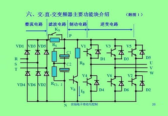 現主要介紹電壓型變頻器結構及原理,電壓型變頻器主電路包括:整流電路、中間直流電路、逆變電路三部分組,交-直-交型變頻器結構見附圖1