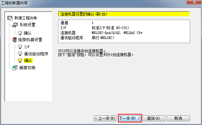 2.1.7 連接機器設置確認,確認機種連接參數設置,單擊[下一步]