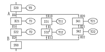 按照匯合狀態(tài)的編程方法,依次將 S21、S31、S32、S41、S42的輸出進(jìn)行處理,然后按順序進(jìn)行從 S22(第一分支)、S32(第二分支)、S42(第三分支)向S50的轉(zhuǎn)移。